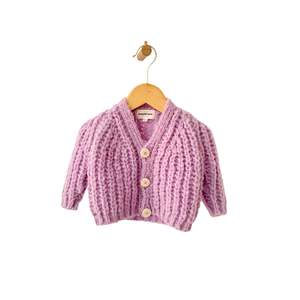 Chunky knit sweater with button closure down the front, V-neckline, and long raglan sleeves. 85% Extrafine Merino Wool, 15% Polyester. Hand wash and lay flat to dry. Do not tumble dry, bleach, or iron. Style number: 2040.