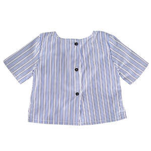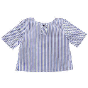Pequeno Tocon, meaning "the smallest in the house" in Spanish, is a family brand based in Barcelona that creates timeless baby clothing for newborns to 2 years old. This shirt features an all-over stripe pattern, a faux button placket detail at the front, button closure down the back, small side seam slits at the bottom, and short sleeves.