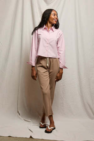 The Naomi is a cropped, boxy long sleeve button-up crafted from crisp cotton poplin. Its clean collar and shortened hem create a modern, effortless silhouette that pairs perfectly with high-waisted bottoms. True to size, with an option to size up for extra room. Machine wash cold; tumble dry low.