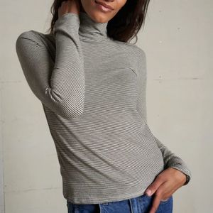 The Cindy top is part of the recycled cotton collectsion. Softly structured with a close fit and lightweight feel, its designed with a classic turtleneck silhouette that hugs just right. This is the kind of piece that makes layering feel intentional, but its just as good worn on its own. This style balances softness and structure, bringing a timeless feel with a fresh edge. Its easy to dress up, down, or layer with whatever your day needs. Fit: Fits close to the body. Full length. Fabric: 70% cotton, 30% recycled cotton. Designed and sewn in California. Care: Gentle machine wash cold. Do not bleach. Tumble dry low. Warm iron if needed. Do not spot treat or add softener. Measurements (body length): XS: 21 1/4"; S: 21 3/4"; M: 22 1/4"; L: 22 3/4"; XL: 23 1/4". Measurements (chest): XS: 13 1/2"; S: 14 1/2"; M: 15 1/2"; L: 16 1/2"; XL: 17 1/2".