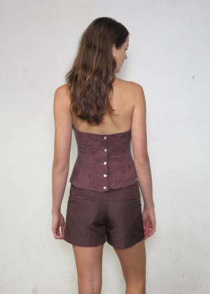 The Diffuse Top features a cowled halter neck and Akoya pearl buttons down the center back. Crafted in a textured Japanese twill, designed to reflect the light and glimmer as you move. Under-bust darts provide shaping through the body. Low backline with button fastening. 86% Lyocell / 14% Nylon. Available in Terra, Ink, and Black. Made in Melbourne, Australia. Lily is 174cm and wears a size XS.