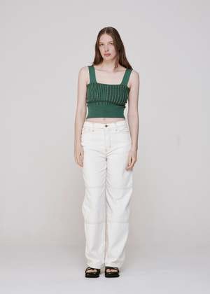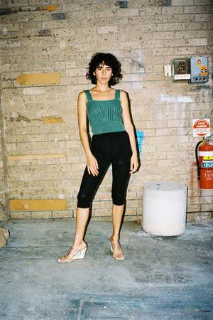 A timeless knitted singlet with wide set straps and fading, linear ribbed details; our Static knitwear capsule is informed by conflicting states of static and momentum. Tonal light and dark teal green yarns. Engineered ribbed panelling. Made in Melbourne. Colour Teal Material 100% Merino Wool Size + Fit Gemma is 178cm and wears size 1 (e-com model images). Size 1 (UK 6-8 / US 2-4) - bust 66cm, waist 50cm, length 30cm, strap 33cm Size 2 (UK 10-12 / US 6-8) - bust 73cm, waist 55cm, length 32cm, strap 34cm PERMANENT VACATION The Permanent Vacation philosophy circles around the simple principle of creating high quality clothes that are easy to wear, effortless, considered, and timeless. Clothes that are informed by art and culture and are designed to fit seamlessly into modern day wardrobes. Operating in Projects rather than seasons allows PV designs to have global relevance instead of being restricted by the traditional seasonal calendar. Focusing on creating well-made pieces and producing only to meet demand, PV design and produce everything locally in Melbourne, Australia.
