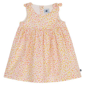 Dress with an all-over multicoloured dot print. - Bow ties at the shoulders - Snap closure down the back - Gathered skirt - Sleeveless 100% Cotton Machine wash up to 30C. Do not tumble dry, bleach or dry clean. Style: A0FHV01.