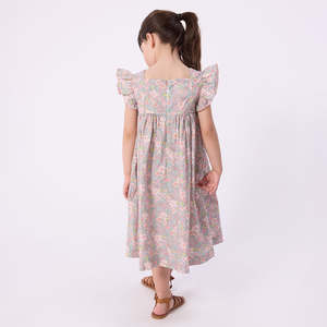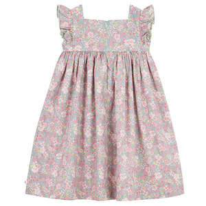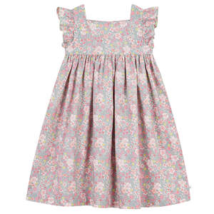 Cotton dress with an all-over floral print. - Zip closure down the back - Ruffles around the shoulders with picot trim - Gathered skirt - Sleeveless 100% Cotton. Machine wash up to 30C. Do not tumble dry, bleach, or dry clean. Style: A0FIS01.