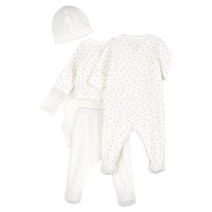 Petit Bateau, established over 120 years ago by Pierre Valton in Troyes, is one of the most established children's brands. Currently designed by Kitsune, Petit Bateau has grown beyond its tradition of knickers and underwear and has created a full collectsion ranging from newborn to adult. - Five piece gift set in soft cotton jersey - Long sleeved pyjamas with enclosed feet, snap closure down the front and all over sketch star print - Long sleeved cardigan with kimono style snap closure at the side and all over sketch star print - Plain white kimono close bodysuit with snap closure at the side and long sleeves - Plain white leggings with enclosed feet - Plain white beanie hat 100% Cotton Machine wash up to 30C. Do not tumble dry, bleach or dry clean. A01PL