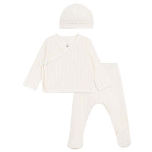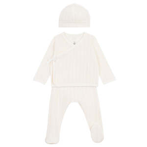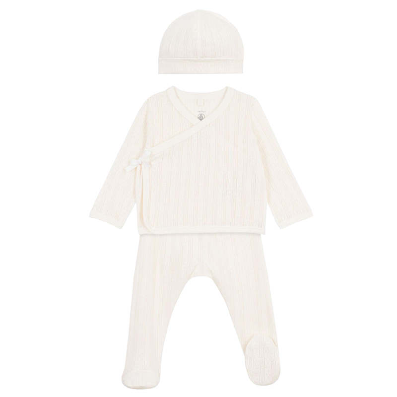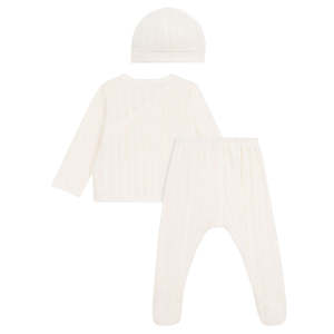 Petit Bateau is a long-established children's brand known for comfortable cotton essentials. This three piece set includes: - Long-sleeved cardigan with tie closure at the sides - Pants with an elasticized waist and attached feet - Beanie 100% Cotton. Machine wash up to 30C. Do not tumble dry, bleach or dry clean.