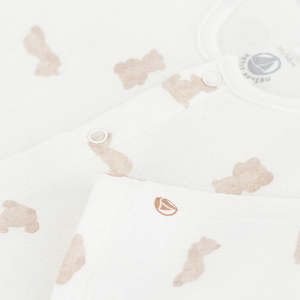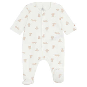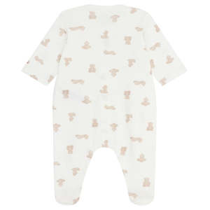 Jersey knit baby sleepwear jumpsuit with an all-over brown bear print. Features enclosed feet, long sleeves, and snap closure down the front and between the legs. 100% Cotton. Machine wash up to 30C. Do not tumble dry, bleach, or dry clean. Style code: A0DRM01.