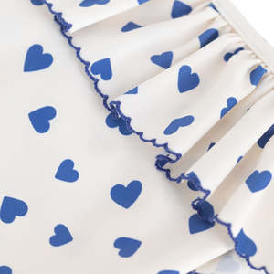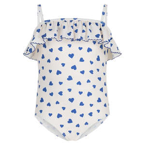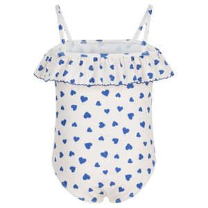 One piece child swimsuit with an all-over heart print. - One piece swimsuit - All-over heart print - Ruffles across the chest with picot trim - Thin straps - UPF 50+ with very high protection rating against UVA and UVB rays Fabric & Care 78% Polyamide, 22% Elastane Lining: 90% Polyester, 10% Elastane Machine wash up to 30C. Do not tumble dry, bleach or dry clean. Style code: A0FJ601 Type: Swimwear