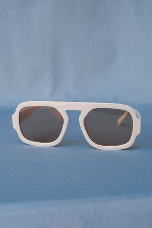 The Veda sunglasses feature a thick, squared-off aviator silhouette with beige frames and off-white beige lenses.
