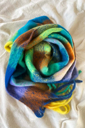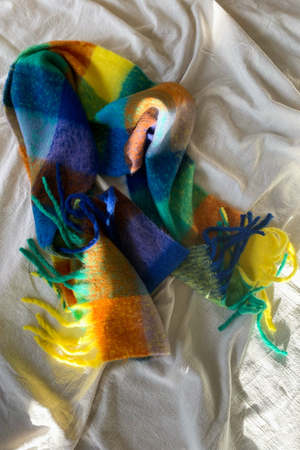 Super soft chunky green toned plaid scarf, with colorful accents of green yellow, orange, and blue. 69 inches long.