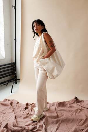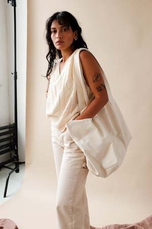 Large oversized canvas tote bag in natural. 100% Cotton. Top width 27.5", bottom width 16", height 14" depth 10". Made in the USA PIPE AND ROW