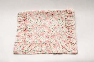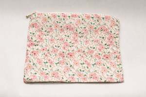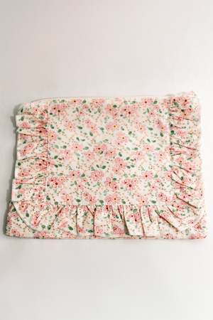 This zippered pouch is made from soft cotton fabric with a delicate floral print, featuring ruffle edging and a brass zipper closure. Perfectly sized for keeping small items such as pacifiers, hair bows, or essentials neatly organized. Dimensions: 9.06 x 7.09. Main Fabric: 100% Recycled Cotton Lining: 100% Recycled Cotton