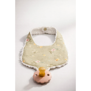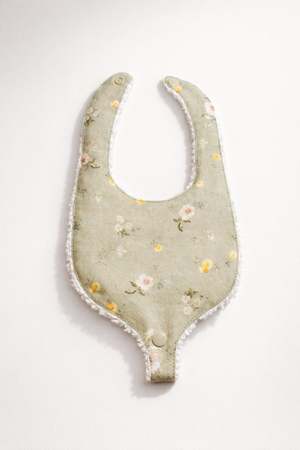 Crafted from pure linen and finished with a soft cotton chenille backing, the Sooth & Snap Pacifier Bib is designed to feel both practical and enduring. The gently contoured silhouette offers generous coverage while remaining lightweight and breathable, making it ideal for everyday wear during early meals and milestones. The linen exterior features the Hedgerow Floral print, a quiet botanical pattern inspired by wild garden edges and soft seasonal blooms. A single snap closure at the neck allows for easy fastening and removal, while the absorbent backing provides comfort against delicate skin. A discreet snap loop at the bottom of the bib allows a pacifier or teether to be securely attached, helping keep it close and off the floor. Each bib is carefully sewn for durability and intended to be washed, reused, and lived in. Size One size (approximately 318 months) Fabric Front: 100% Linen Back: 100% Cotton Chenille