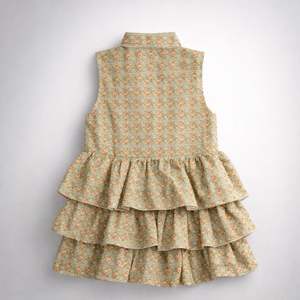 The Antoinette Dress by Piper&Cloth is made from 100% cotton, designed for both comfort and a timeless aesthetic. This sleeveless dress features a button-down front and a neatly tailored collar for a refined touch. The multi-tiered ruffle skirt adds a playful flair, while the intricate floral print brings a vintage-inspired charm.
