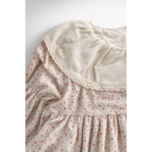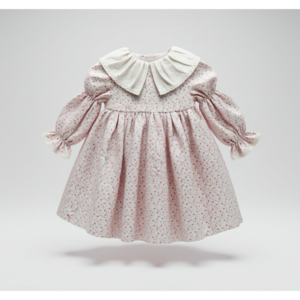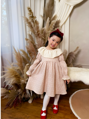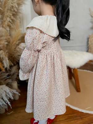 The Marguerite Dress features a gathered skirt and a dramatic oversized collar trimmed in lace. Crafted from rosebud floral cotton and fully lined for comfort, it has long elasticized sleeves gently shirred at the wrist with a scalloped lace cuff. Finished with wooden back buttons. Available in sizes 2Y8Y. Care: Wash gently in cold water, avoid bleach, and reshape the collar while damp to maintain its shape.