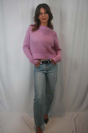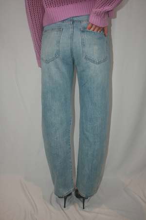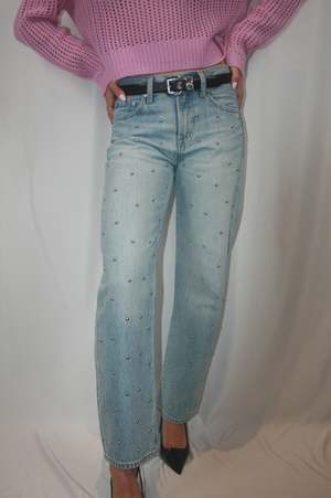 The Lexi Mid Rise Bowed Straight Jean sits at a perfect mid-rise with a signature bowed straight leg and a subtle curve at the knee for added dimension. Finished with a 29" inseam, the silhouette tapers to a cropped ankle with a clean hem. Crafted from rigid denim in Aries, a light blue wash adorned with subtle stud details for a refined look. SIZE AND FIT Rise: 10" Leg Opening: 17 1/2" Inseam: 29" Model is 59 wearing size 26 100% Cotton Imported
