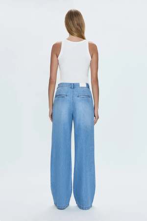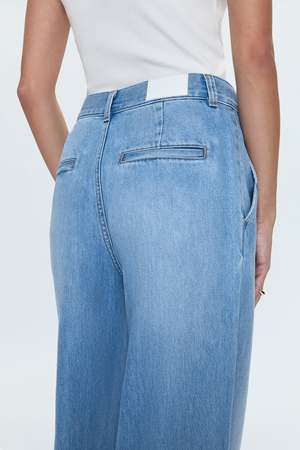 The Dalia denim trouser is made from a blend of tencel and denim, giving it a sleek and fluid texture. The fabric has been washed to achieve a subtle mid indigo hue. The trousers feature clean detailing, elevating the traditional wide leg jean. - Wash: Palo Alto - Material: 62% Cotton / 38% Lyocell - Care: Wash Cold