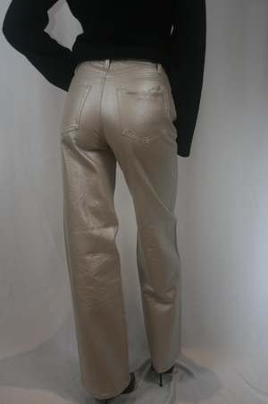 A signature shape, Tate features a high rise, bowed wide leg, and full-length 32" inseam that creates elegant movement and modern proportion. Crafted from 100% cotton non-stretch denim in Champagne Luster, a pearly coated finish that reflects light with every step for an effortlessly elevated look. SIZE & FIT Rise: 12 Leg Opening: 21 Inseam: 32" Model is 59 wearing size 26 100% Cotton Imported