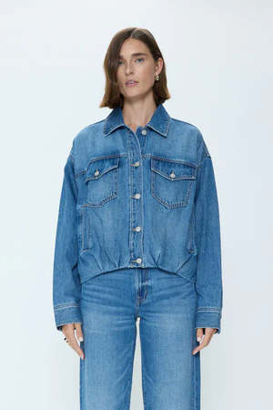 The Bibi jacket by Pistola reinvents the classic denim jacket with a soft yet structured blouson silhouette. Made from 100% non-stretch cotton denim, it holds its shape while offering a relaxed drape and subtle volume that elevates your look. With dropped shoulders, clean seams, and a slightly cropped length, the Bibis balanced proportions make it easy to style with anything. Pair it with the Donny jean from the same collectsion for a perfect denim-on-denim outfit. Details: - Relaxed fit - Button front closure - Dropped shoulders - Buttoned patch chest pockets - Slanted front pockets - Folded front hem - Elastic band at back of bottom hem - Length: 23 1/2" / 59.7 cm - Color: Heartfelt - True to size - Model is 5'9" and wears size S - 100% cotton - Machine wash Type: Jacket