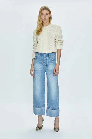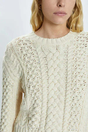 The Quinn Sweater by Pistola offers classic cable-knit charm with a cropped fit for a contemporary look without bulk. It combines traditional texture with modern proportions for a flattering silhouette. Crafted from a luxurious blend of cotton and wool, this sweater is thick and comfortable for all-day wear. - Straight fit - Crew neckline - Length: 20 1/2 / 52 cm - Color: Ivory - True to size - Model is 1.75 m and wears size S - 55% cotton, 17% polybutylene terephthalate, 5% wool, 3% nylon - Dry clean only