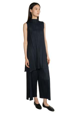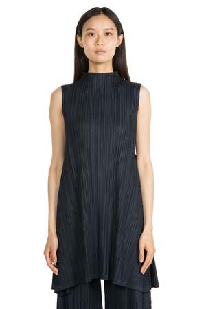 The Mellow Pleats Tunic by Pleats Please by Issey Miyake features a sleeveless, mock neck design with blue black pleated fabric. Crafted from a soft, matte polyester, this tunic offers an elegantly flared silhouette and combines convenience, comfort, and a strong visual presence. Composition: Polyester. Code: PP56JT2821403.