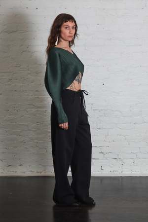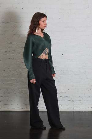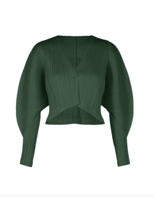 This cropped V-neck cardigan by Pleats Please Issey Miyake in forest green features a single-button closure and stylish balloon sleeves. Pleats Please was first launched through mainline Issey Miyake in 1988 and became a signature brand with an independent Spring/Summer 1994 collectsion. Through extensive exploration of advanced garment construction techniques, Issey Miyake developed a patented technique called Finished Pleating that remains the foundation of Pleats Please. Reversing the conventional pleating process, garments are first cut and sewn and then pleated, making for highly adaptable and easy-to-wear pieces. Pleats Please offers simple yet elevated statement pieces with vivid colors and prints that enhance each garments sculptural sensibilities. Color Forest Green (Color 64) Fabric & Care 100% Polyester. Pleats Please pieces are lightweight, easy to layer, anti-static, and resist wrinkling. Do not dry clean, steam, iron, bleach, tumble dry, or use fabric softener. Machine wash cold on a gentle cycle with gentle detergent. Dry flat in the shade. Do not line dry. Roll in the direction of the pleat to store. Do not hang. Fit Each Pleats Please garment fits standard sizes 018. Pleats Please garments have a unique size scale based on garment length: Size 1 is the shortest length and Size 5 is the longest length. Due to the garment pleating technique, which provides great stretch and comfort, there is only a minor change in garment width between sizes, so you should select your size based on length only. On average, the difference between sizes is approximately 12" in length with slight variations in armhole openings. Measurements Length: 44.0 cm Sleeve length: about 80 cm Made in Japan.
