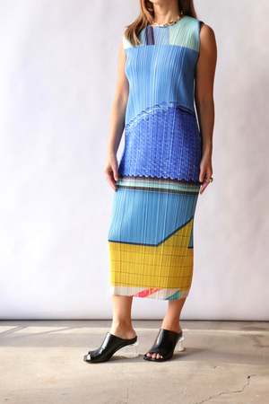 Discover the artistry of urban landscapes with this elegant sleeveless crew-neck dress. Featuring a distinctive design that merges three unique patterns into a cohesive collage, this piece captures the dynamic essence of evolving cityscapes through thoughtfully layered photography. A sophisticated choice for those who appreciate wearable art and contemporary design. - Color: Blue/Yellow (no.7) - 100% Polyester - Machine wash - Made in Japan