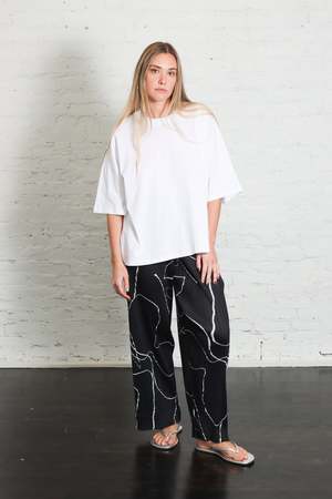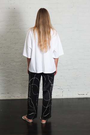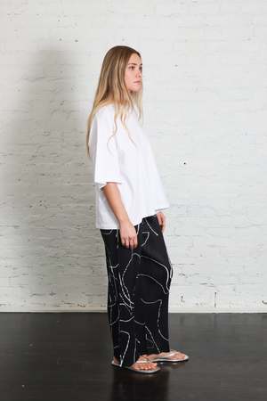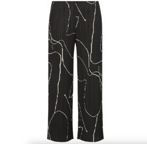 These black straight-leg pleated trousers have an elasticated waistband and side pockets. The striking print of PAUSE depicts the outlines of bodies in various poses, expressed through flowing lines. It captures the strength and poise of a motionless figure. 100% Polyester. Pleats Please pieces are lightweight, easy to layer, anti-static, and never wrinkle. Made in Japan. Care: Do not dry clean, steam, iron, bleach, tumble dry, or use fabric softener. Machine wash cold, gentle cycle, gentle detergent. Dry flat in the shade. Do not line dry. Roll in the direction of the pleat to store. Do not hang.