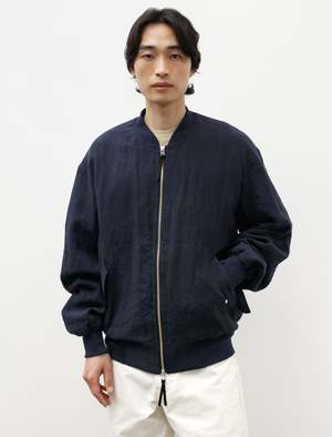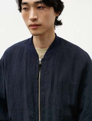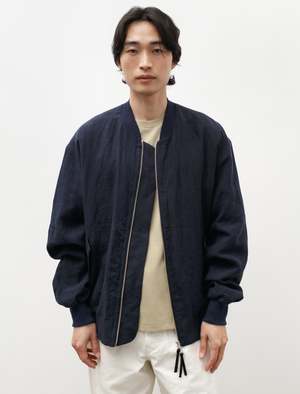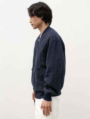 A loose fitting relaxed bomber jacket cut from a lightweight, slubby linen plain weave in an inky shade of navy. Features a classic bomber rib knit collar, a two way zipper with custom leather zipper pulls, front snap closure welt pockets with flap, and ribbed hems. Fully lined in cotton poplin for an elegant, utilitarian finish. The bounciness of the linen lends itself nicely to movement and makes for a relaxed, elegant silhouette. - Made in Japan - 100% linen; lining: 100% cotton - Relaxed fit - Dry clean only - KIM IS 6'0", 155LBS AND WEARS SIZE 3/M