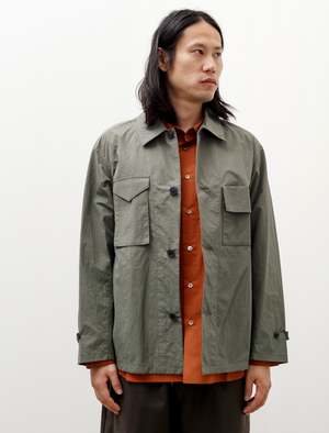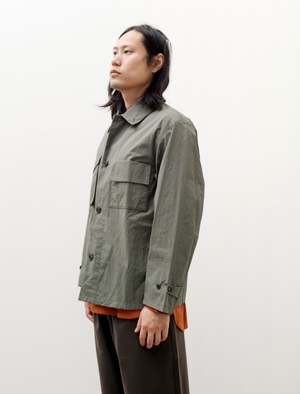Boxy work jacket in a crinkled, sage green cotton-poly ventile. Asymmetric chest patch pockets with flap closures, and two large interior pockets at the waist. Flat felled seam finishing throughout for improved durability. Horn buttons. - Made in Germany - 74% Polyester, 26% Cotton - Relaxed fit - Machine wash - Ed is 6'0", 170lbs and wears size 3/M - Product Measurements SIZE Pit to Pit Shoulders Neck to Cuff Back Length 2/S 22" 20" 30.25" 27.5" 3/M 23" 21" 31" 28" 4/L 23.75" 21" 32.25" 29"