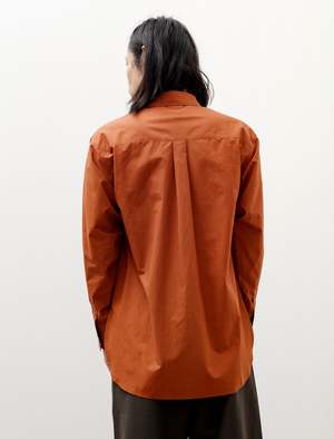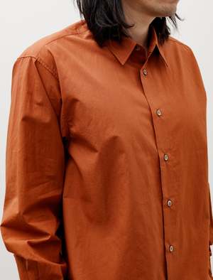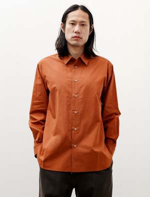 A relaxed fitting button-front shirt cut from a crisp cotton-linen shirting in ochre. Features a two-piece clean finished back yoke with box pleat, pleated sleeves at cuff, and split side seams. A square cut hem with curved corners and a dropped back hem make for an easy, relaxed silhouette. Flat felled seam finishing throughout for robust elegance, mother of pearl buttons. - Made in Japan - 90% Cotton, 10% Linen - Relaxed fit - Dry clean - Ed is 6'0", 170lbs and wears size 3/M - Product Measurements SIZE Pit to Pit Shoulders Neck to Cuff Back Length 2/S 21.5" 19.5" 30.5" 31.5" 3/M 23" 20" 31.5" 32.5" 4/L 23.75" 20" 31.5" 33"