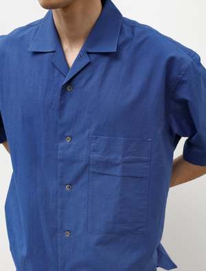 An oversized, short sleeve button front shirt cut from a super lightweight, airy cotton/silk shirting in a melange blue with subtle hatching. Features a camp style convertible collar, a dual entry stacked patch pocket, and a clean-finished two piece yoke with a generous inverted box pleat. The wide body and generous sleeves allow for easy layering or make for a generous, airy silhouette when worn alone; the straight cut, dropped back hem evokes a traditional Japanese style but is updated with modern detailing. Durably constructed with flat felled seams throughout for a hard wearing finish that will last many years to come; mother of pearl buttons. - Made in Japan - 87% cotton,13% silk - Oversized - Machine wash - KIM IS 6'0", 155LBS AND WEARS SIZE 3/M