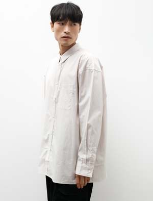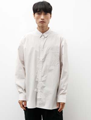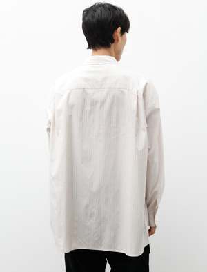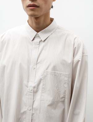 A generously oversized button front shirt cut from a super crisp cotton poplin in a warm beige with golden pinstriping throughout. Features a shrunken, pointed classic collar, a strap style button placket, a left breast pocket, and a clean finished yoke with pleats at the shoulders. The generous body combines with a slightly dropped armhole to create a dynamic silhouette that responds well to movement. Constructed using flat felled seams throughout for a hard wearing, elegant finish that is built to last; mother of pearl buttons. - Made in Japan - 100% cotton - Oversized - Machine wash - KIM IS 6'1, 155LBS AND WEARS SIZE 3/M