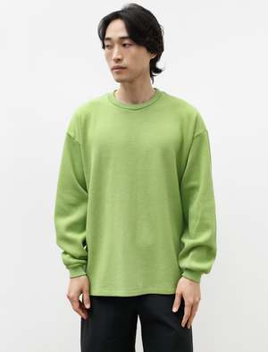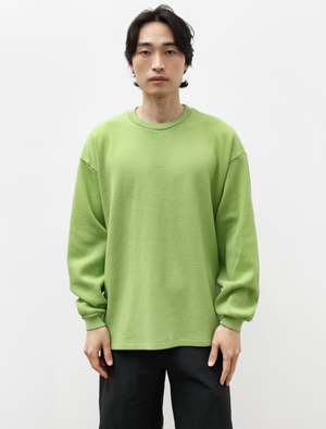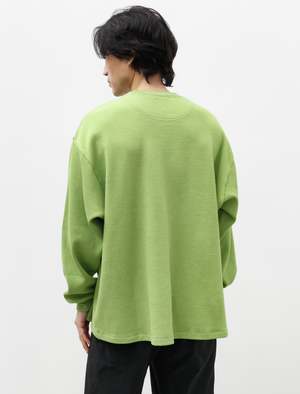 An oversized long sleeve t-shirt cut from a heavy, plush, military style, mesh thermal jersey in apple green. Features a dropped, curved back hem, a ribbed collar, and ribbed cuffs. The wide body and dropped armhole allow for easy layering and provide added movement when worn alone. Finished with a self facing at the back neck and shoulder-to-shoulder taping along the back neck for reduced abrasion and improved comfort. - Made in Japan - 100% cotton - Oversized - Machine wash - KIM IS 6'0", 155LBS AND WEARS SIZE 3/M