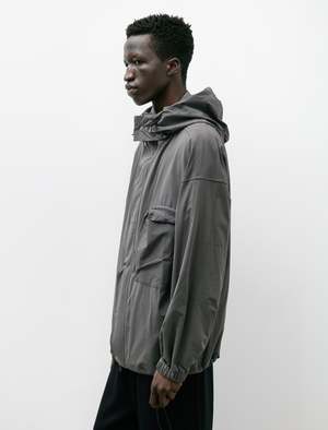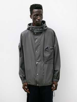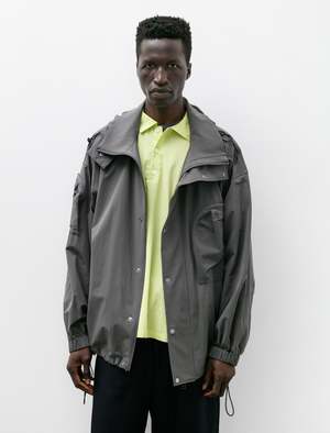 A boxy, generous, zip-front jacket cut from a lightweight, technical, stretch nylon in a muted charcoal grey. Features an adjustable removable hood with a storm flap, a two-way zip closure with a snap down zipper placket, on-seam pockets at the waist, curved pleated pockets with zip closures at the right sleeve and left breast, and adjustable elastic drawcords at the hem. Dropped shoulders and room proportions through the body combine with a darted two-piece sleeve to create a gentle forward tilt to the silhouette with elegant curves throughout; elastic cuffs and the waist cinch create bloused effects throughout, further highlighting the curved appearance. Constructed using durable flat felled seams for a hard wearing finish that leaves an exceptionally tidy interior.