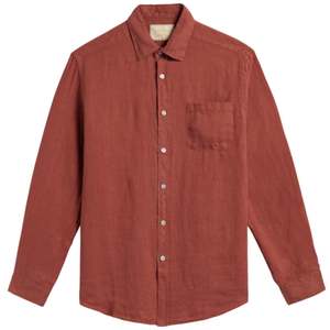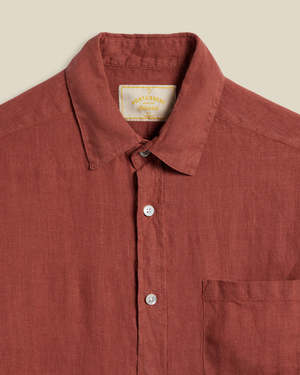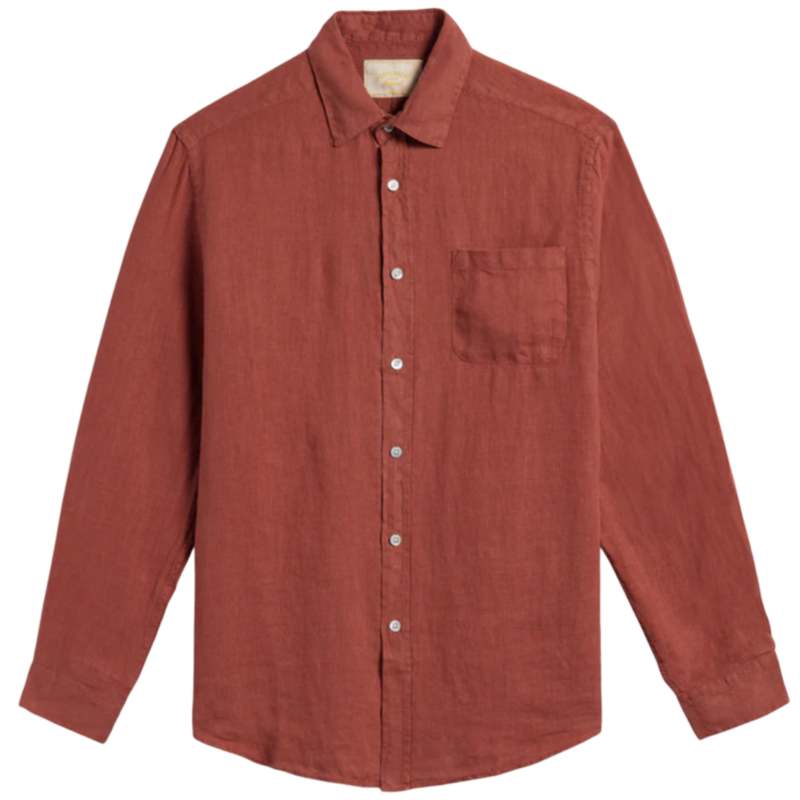 Linen shirt with a cutaway collar, mother-of-pearl front button closure, left chest pocket, long sleeves, curved hem, and a straight fit. Composition: 100% Linen Made in Portugal.