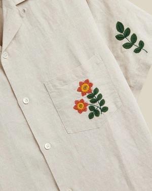 Linen and cotton blend shirt with floral embroidery. Shell mother-of-pearl buttons. 54% linen, 46% cotton. Made in Portugal.