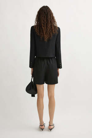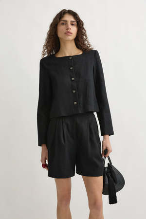 Cut from hand-loomed linen, the Emma Jacket from Posse has a boxy fit with an elegant high neckline and softly padded shoulders. It fastens with chic mottled buttons. - Centre front buttons - Shoulder pads - Cropped length - Boxy style silhouette - Lined - Fits true to size, take your normal size in this style - Designed for a relaxed fit - Darcy wears a size S and her measurements are Height: 181cm, Bust: 81cm, Waist: 63cm, Hips: 86cm - Material: 100% Linen