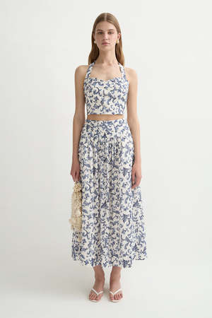 Designed in a beautiful cotton sheeting, the Rue Skirt is designed to sit at the waist, featuring elegant tuck details and a gathered skirt for a simple yet refined silhouette. Color: Blue Baroque Fabrication: 100% Cotton Fit Notes: True to size