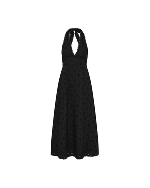 The Salma Dress is crafted from embroidered cotton with delicate lace trim detailing. It features a halter neck tie, shirred back bodice, and a soft, flowing midi-length skirt. Lined with a zip entry.