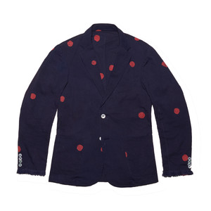 Our standard jacket is constructed from Portuguese seersucker treated in "Adire" - a rare hand dyeing process developed by the Yorubas in the Southwest region of Nigeria. Prior to dyeing, the artist hand paints patterns using a cassava starch paste that acts as the resist dye. Our focus was to transform an old world technique into a new form of design. Due to the nature of the process, each product varies in uniqueness and individuality, giving them a one of kind feel. - Unstructured single breasted sport jacket. - Megadot pattern. - Indigo-Red - Unlined. - Notch lapel. - 2 button closure. - Single vent. - Frayed cuffs. - Corozo buttons. - 100% cotton. - Hand-dyed in Nigeria, constructed in U.S.A. - Colors may slightly vary due to the nature of the dyeing process.