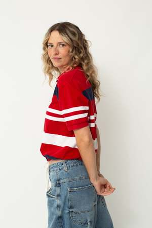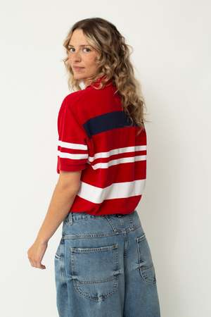 The reworked polo is an update to a classic, with a cropped length and an added drawstring for versatility. Designed in collaboration with owner and buyer Nicole Trower, each top has been handcrafted by our sewing intern Halle Piehl in Ames, Iowa. - Polo Ralph Lauren - 100% Cotton - Cropped with cotton drawstring Size fit: Relaxed oversized fit. Bust: 43" Front length: 19.5"
