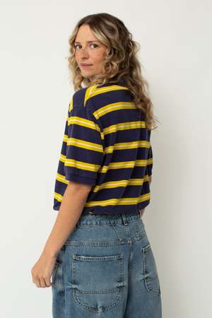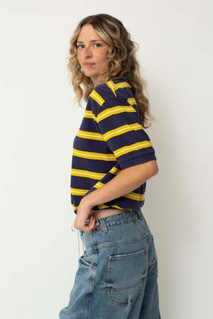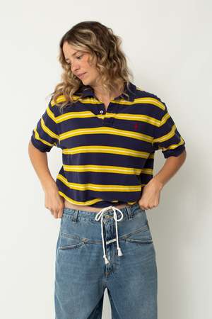 The reworked polo is an update to a classic, featuring a cropped length and an added drawstring for versatility. Designed in collaboration with owner and buyer Nicole Trower, each top has been handcrafted by our sewing intern Halle Piehl in Ames, Iowa. - 100% Cotton - Cropped with cotton drawstring - Size M/L: Bust 43", Front length 19.5" Relaxed oversized fit.