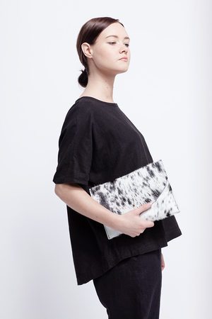 A versatile bag that can be used for an evening out or as a sleeve for most tablet and e-readers. - Brazilian cowhide exterior - Antique brass button stud fastener - Unlined - Fits most tablets and e-readers - Measures approximately 10.5 W x 7 T - Made in Portland, Oregon Each bag is unique. Due to the variation in coloring and patterning of each cowhide, the bag you receive may be slightly different than the photos shown.