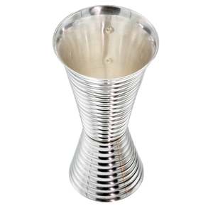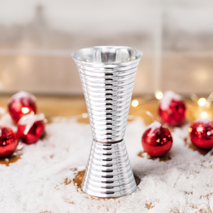 Premium handcrafted polished double-sided jigger for elegant entertaining. The hourglass shape with precise measurements punched into the body for easy visibility inside the cups makes creating both simple and complex cocktails a visual splendor. Features 2 ounce and 1 ounce cups soldered together, with 1/2 ounce, 3/4 ounce, and 1 1/2 ounce indentations struck into each cup for an accurate pour. Made from 100% pure heavy-gauge copper with silver plate, this modern classic design is ideal for mixing premium cocktails with added sophistication. The smaller jigger is 1 ounce with a 1/2 ounce measurement mark. The 2 ounce side has 3/4 and 1 1/2 ounce marks for measurement. The jigger is a work of art, standing at 4 1/4 inches tall and presented in a premium gift box. Care: Hand wash and dry. Lacquer coating helps prevent tarnishing.