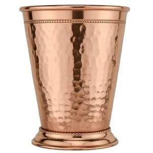 These heavy, handmade pure copper Mint Julep Cups are inspired by the original cups made in Kentucky during the 1800s. Each cup has the Prince of Scots mark on the bottom to certify quality. Prince of Scots adheres to the traditional design down to the last detail. The cups are the same size and proportion as the originals and feature exquisite decorative beading. Fill this cup with bourbon, sugar, ice, and a handful of mint for a classic mint julep, or use it for any of your favorite cocktails. Hold by the base or rim so frost will coat the cup. The 12-ounce capacity makes this cup ideal for cocktails or iced tea, and the beautiful design also works as a desktop container for flowers or pens. Each cup uses top quality copper and includes a lacquer coating to help prevent tarnishing. Hand wash only.