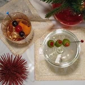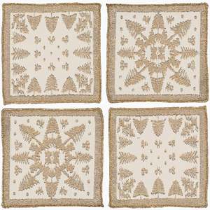 Scottish Leno Gauze Cocktail Napkins in gold lurex, woven in Scotland on centuries-old Leno Gauze Madras looms. Material: 85% cotton, 15% gold lurex with serged edges. Measurements: Set of 4 cocktail napkins, each 6 1/2 inches x 6 1/2 inches. Destined to become a family heirloom to be passed down through the generations. Inspired by a handmade Finnish Christmas card. Care Instructions: Wash with a delicate hand wash in cool or lukewarm water using a mild detergent with no tetrachloroethylene. Air dry and reshape while wet. Do not tumble dry. Finish with a cool iron. Style: 170226.