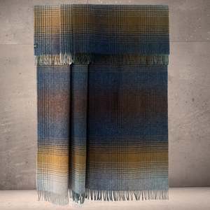 The Highland Tweeds Shetland Lambswool Ombre Throw by Prince of Scots is woven in the British Isles from premium 100% Shetland lambswool. It features a blue ombr plaid that fades from deep navy into lighter blue and sky tones and is finished with a fringe. Measuring approximately 54" W x 72" L including fringe, this generously sized throw is ideal for sofas, beds, or armchairs. The naturally breathable wool provides all-season comfort, offering warmth without overheating. Details & Dimensions - Fiber content: 100% Shetland lambswool - Dimensions: approx. 54" x 72" including fringe - Origin: Woven in the British Isles - Design: Blue ombr plaid with fringe finish - Colourway: Deep navy fading to lighter blue and sky tones Care Instructions Professional dry cleaning is recommended to preserve the natural beauty of Shetland lambswool. Between cleanings, shake out or air the throw occasionally to keep the fibers fresh. Avoid direct heat and do not tumble dry.