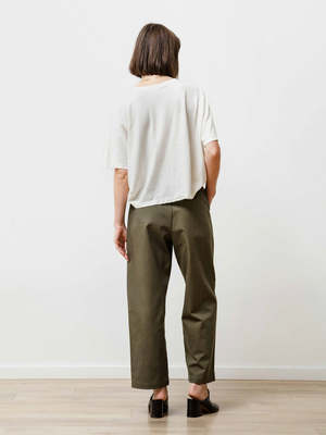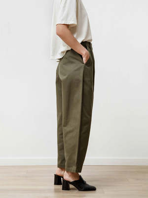 Our longer version of our classic trouser with a tapered bow leg and hidden zip-button fly. Fold them / Roll them / wear them as is! Feels like: Soft but structured canvas 100% Cotton Canvas | Hand wash Cold Made in Vancouver, Canada. Fit: Sara is 5' - 6" | Waist: 24.5" | Hips: 35" and she is wearing X Small Fit Guide*: XS: - Waist: 26" - Hips: 41" - Rise: 11.5" - Inseam: 29" S: - Waist: 27" - Hips: 42" - Rise: 12" - Inseam: 30" M: - Waist: 29" - Hips: 43" - Rise: 12.5" - Inseam: 31" L: - Waist: 31" - Hips: 44" - Rise: 13" - Inseam: 32"