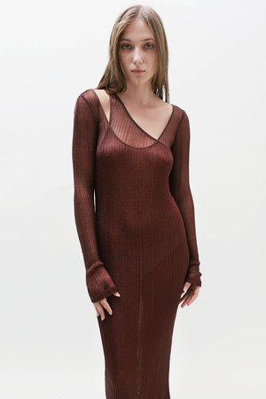 The Double Layered dress is two separate dresses layered for opacity. The underdress is an off the shoulder tank top while the top layer is a scoop neck long sleeve dress. The rib knit is enhanced with a metallic shimmering finish under the right lighting. This piece can be worn as separates (shown). Slinky, slick and, comfortable wear.
